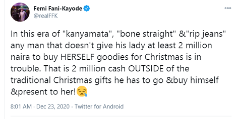 He tweeted, In this era of “kanyamata”, “bone straight” &”rip jeans” any man that doesn’t give his lady at least 2 million naira to buy HERSELF goodies for Christmas is in trouble. That is 2 million cash OUTSIDE of the traditional Christmas gifts he has to go &buy himself &present to her!”