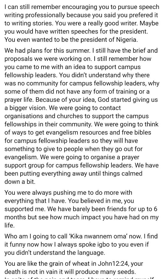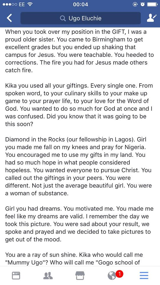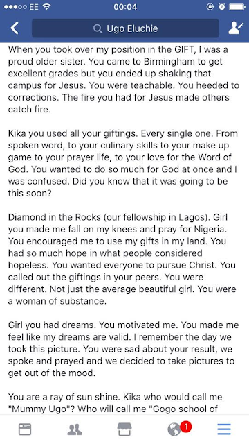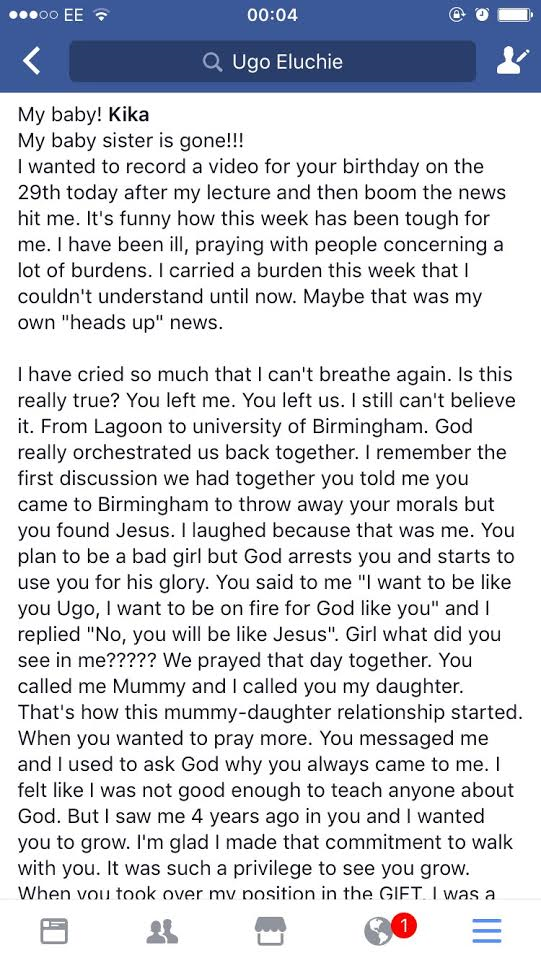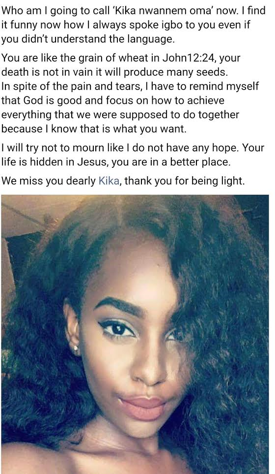 Tributes have been pouring in from her friends, family and boyfriend. They revealed she was a gentle soul, kind and generous. Kika will be laid to rest at Ikoyi cemetery on Tuesday April 18.