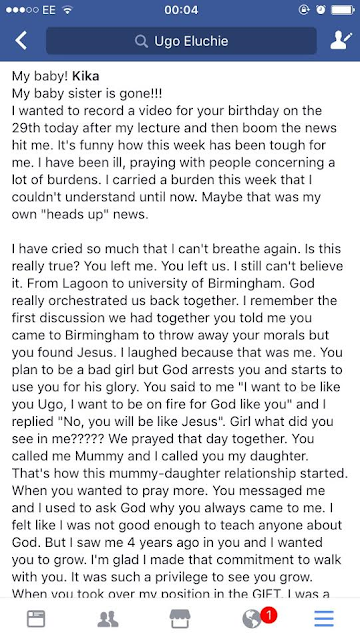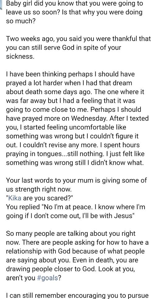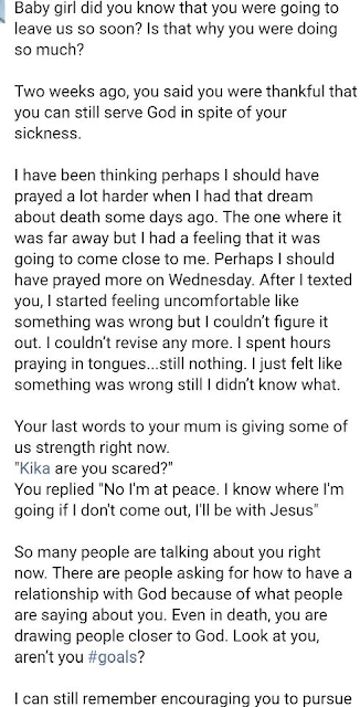 Apparently, Kika traveled down to Nigeria from UK to get treated for what she felt was an infection, but later turned out to be a ruptured appendix. Kika’s last moment with her mother was when she asked her: “Kika, are you scared?” to which she replied her mum: “No, I’m at peace. I know where I’m going if I don’t come out and I will be with Jesus”