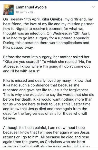 Her Boyfriend, Emmanuel Ayoola, took to his Facebook to share the story and also recount her last words to her mother.