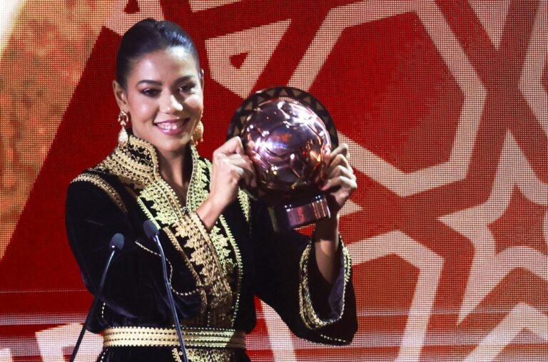 Al-Hilal’s forward Ghizlaine Chebbak holds her African Women’s Player of the Year award during the 2025 Confederation of African Football (CAF) Awards in Sale, Morocco on November 19, 2025. (Photo by Abdel Majid BZIOUAT / AFP)