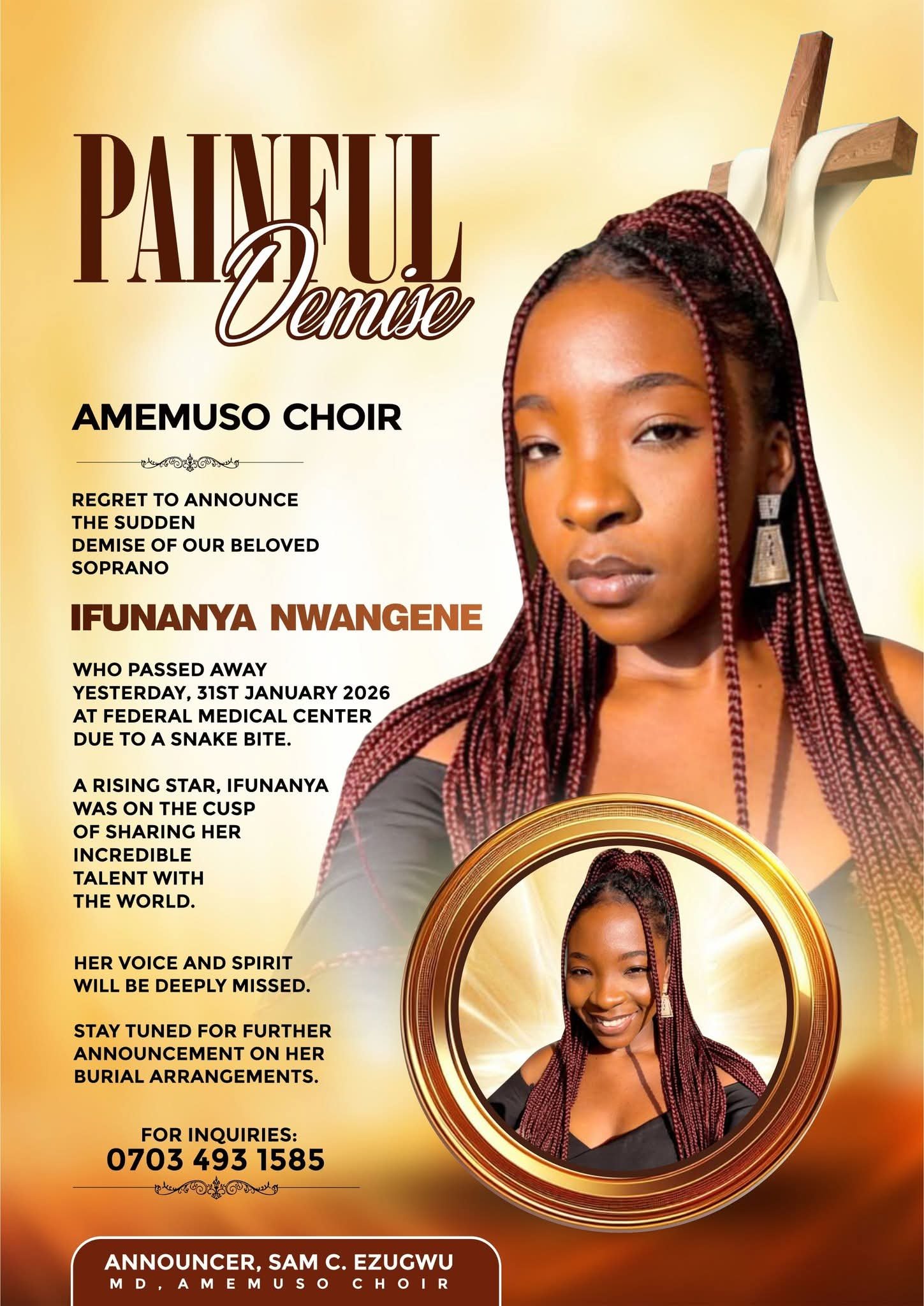 “We regret to announce the sudden demise of our beloved soprano, Ifunanya Nwangene, who passed away yesterday, 31st January 2026, at the Federal Medical Centre due to a snake bite,” the statement partly read.