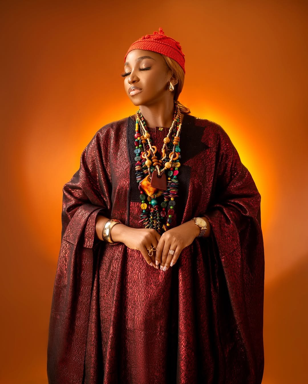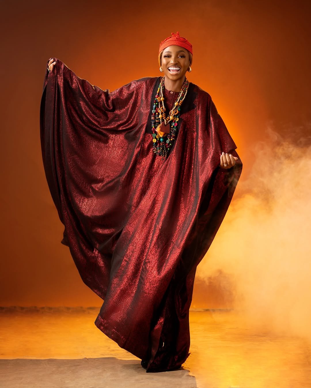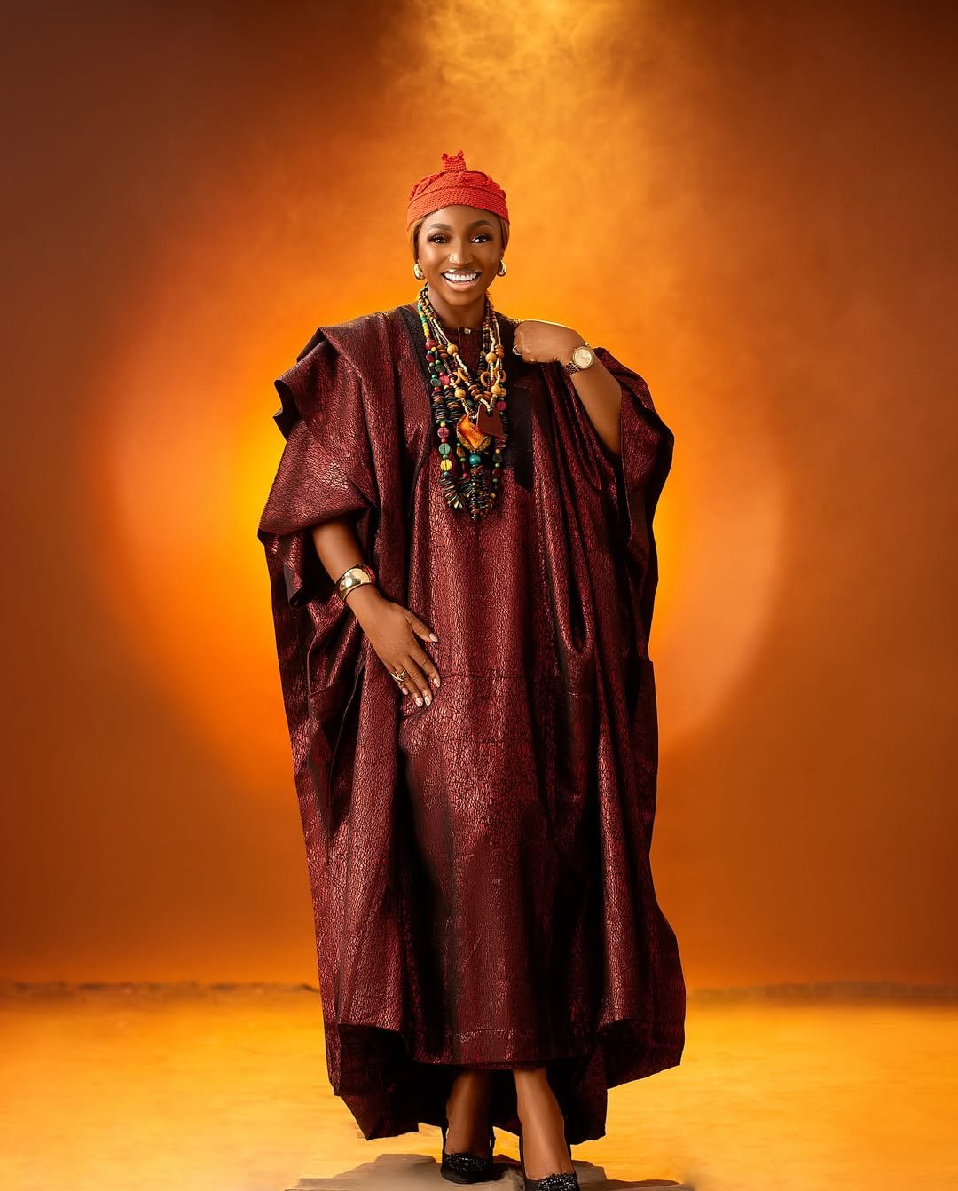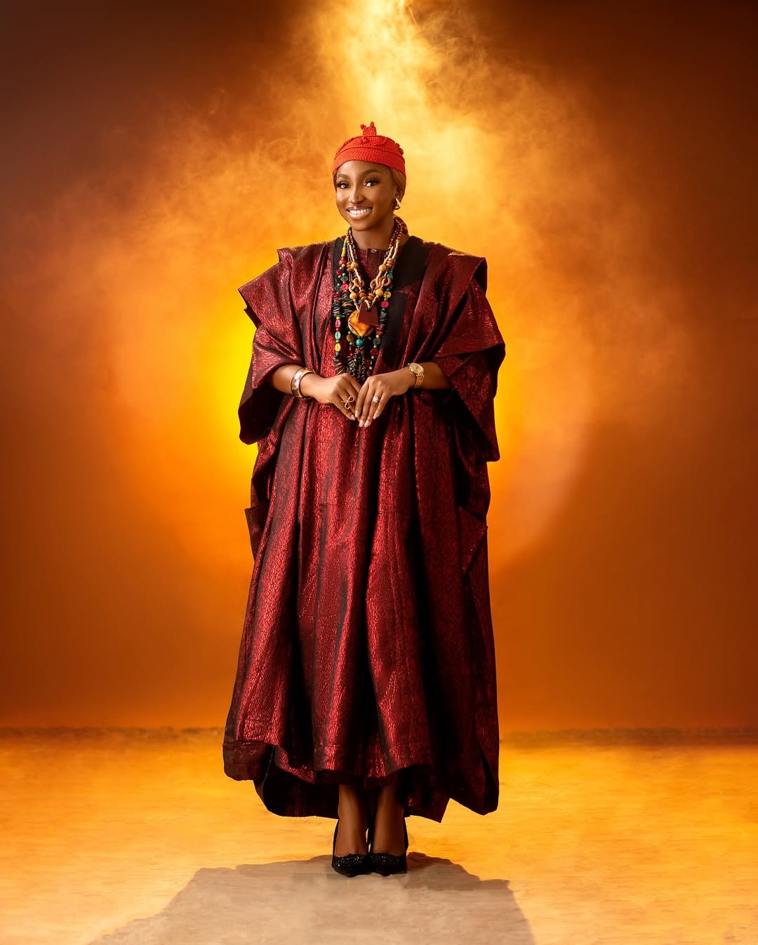 She complemented her regal look with black heels, colourful multi-layered beaded necklaces, and fila, grounding the look firmly in Yoruba tradition.