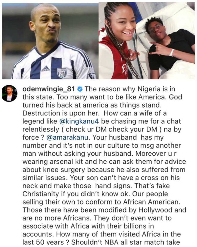 Former Nigerian footballer, Peter Osaze Odemwingie has called out Amara, the wife of legendary footballer, Nwankwo Kanu for always disturbing his phone.