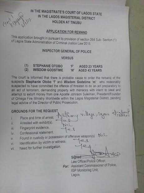 Apostle Suleman‘s alleged mistress, Stephanie Otobo, was arraigned alongside her male colleague, Wisdom Godstime, today at the Chief Magistrate Court in Tinubu, Lagos . The duo were arraigned on a four count charge which includes terrorism and extortion.
