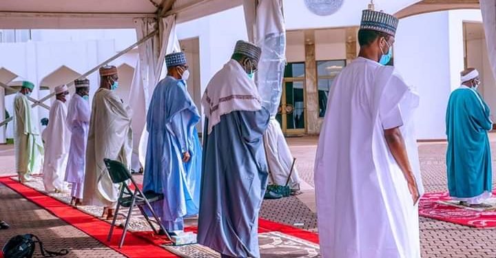 Here are photos of President Buhari observing Sallah prayers with few others today as Muslims all over the world celebrate Eid-El Kabir.
