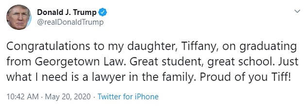 President Donald Trump has tweeted his heartfelt congratulations to his youngest daughter, Tiffany after she graduated from Georgetown Law — while joking that having a lawyer in the family is ‘just what he needs’.