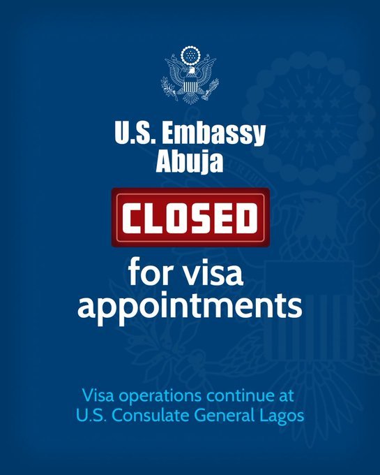 It stated, “U.S. Embassy Abuja is closed for visa appointments. Applicants should check their email for details on rescheduled appointments.”